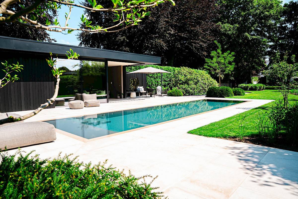 • Overloop zwembad afgewerkt met Alkorplan Relief liner - Antraciet